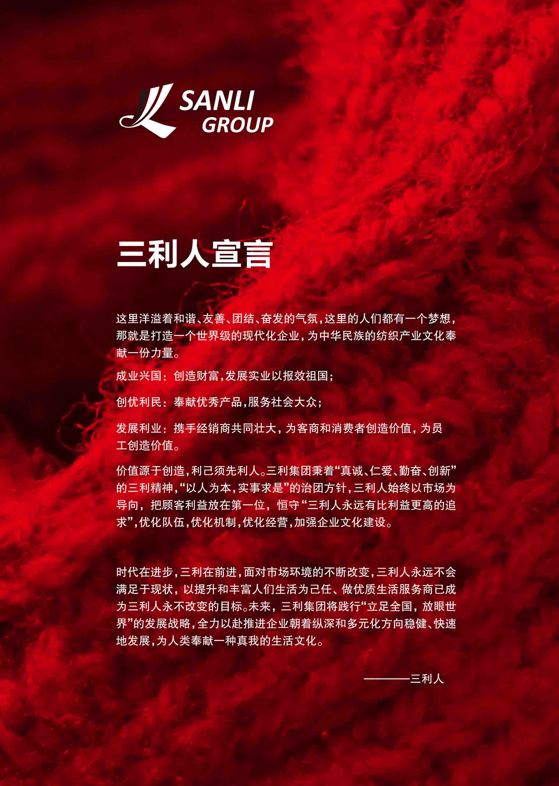 企業(yè)價(jià)值觀:三利人永遠(yuǎn)有比利益更高的追求 企業(yè)宗旨:利國(guó)、利民、利業(yè) 企業(yè)精神:真誠(chéng)、仁愛、勤奮、創(chuàng)新 企業(yè)使命:裝點(diǎn)人生 編織未來 服務(wù)大眾 生存理念:戰(zhàn)戰(zhàn)兢兢,如履薄冰 企業(yè)心理:感恩社會(huì),感恩消費(fèi)者,真誠(chéng)處事,低調(diào)做人 企業(yè)作風(fēng):快速反應(yīng),操作到位